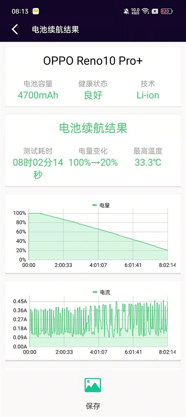 經(jīng)過測(cè)試,電量從100%消耗至20%用時(shí)8小時(shí)2分14秒,經(jīng)過折算,滿電續(xù)航大約在10小時(shí)左右,滿足中度用戶使用一天的需求。