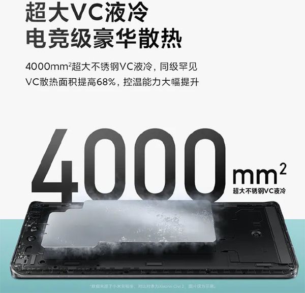 在這個(gè)散熱方面,小米civi3配備4000mm2不銹鋼VC液冷,VC散熱面積提高68%,控溫能力大幅提升。