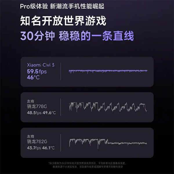 小米civi3挑戰(zhàn)某開放世界手游,30分鐘,穩(wěn)在59.5fps,溫度為46°C。