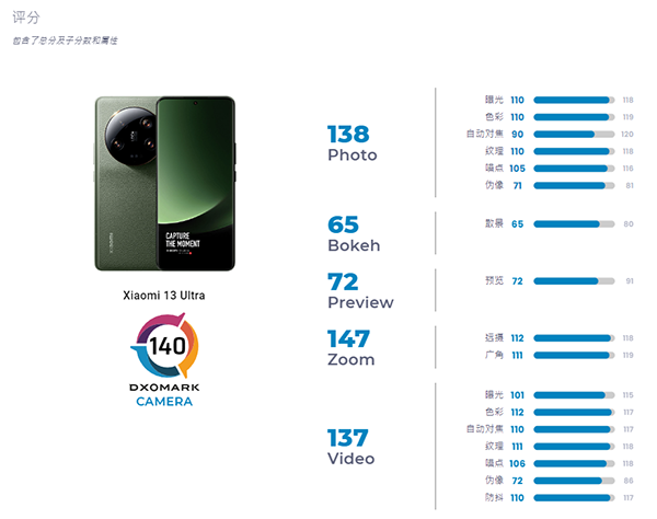 小米13 Ultra盡管整體表現(xiàn)優(yōu)秀,在變焦子項表現(xiàn)尤為突出,但仍遠(yuǎn)遠(yuǎn)低于其他競品如華為P60 Pro(156分)、OPPO Find X6 Pro/X6、榮耀Magic5 Pro(分別為153分、150分、152分)以及去年的華為Mate50 Pro(149分)、P50Pro(143分)和iPhone13 Pro(141分)。