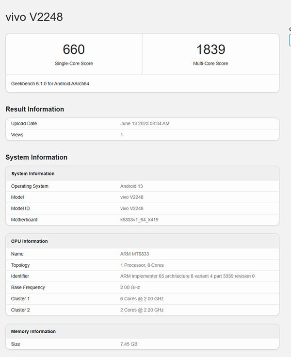 從 Geekbench 6 的跑分來看,vivo Y27 5G 單核和多核測試中分別獲得了595分和1770分是,十分符合天璣6020。