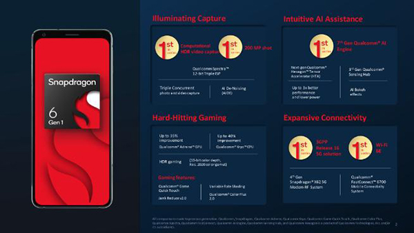 驍龍6Gen1的CPU是8核定制,最高頻率可達(dá)2.2~2.3GHz,它還集成了第七代驍龍AI引擎,AI性能提升了3倍。支持5G網(wǎng)絡(luò),配備了驍龍X62調(diào)制解調(diào)器,下行峰值2.9Gbps。支持LPDDR5內(nèi)存、藍(lán)牙5.2、Wi-Fi 6E,相機(jī)最高支持108MP單攝,并擁有FastConnect 6700快速連接系統(tǒng)。