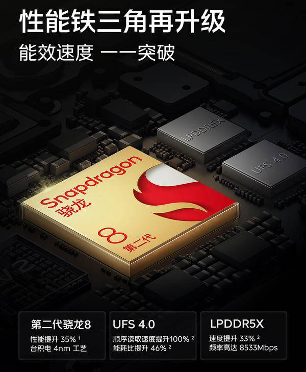 第二代驍龍8自然不必多說,其采用臺積電4nm工藝,較上一代性能提升35%,另外LPDDR5X內(nèi)存也將是旗艦機(jī)的標(biāo)配,頻率高達(dá)8533Mbps。UFS4.0順序讀取速度提升100%,能耗比提升46%。這套配置妥妥的性能怪獸。
