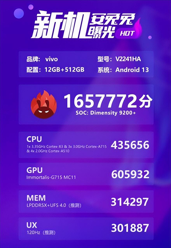 根據(jù)安兔兔公布的信息顯示,在安兔兔V10版本綜合跑分成績(jī)?yōu)?657772分,其中CPU部分為435656分,GPU部分的得分是605932分。MEM成績(jī)?yōu)?14297分,UX部分則為301887分。