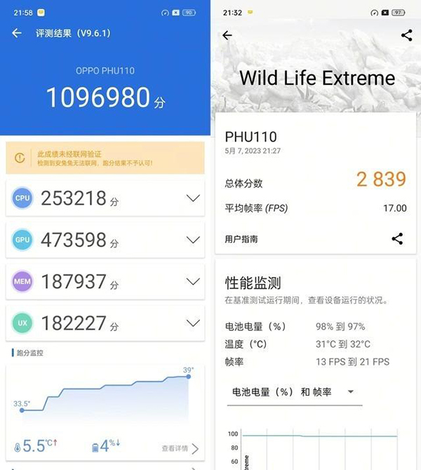 OPPO Reno10 Pro+的跑分表現(xiàn)。該機(jī)的安兔兔跑分為1096980分,3D Mark Wild Life Extreme總分達(dá)到了2839分,可以排到今年安卓陣營(yíng)的前幾名。