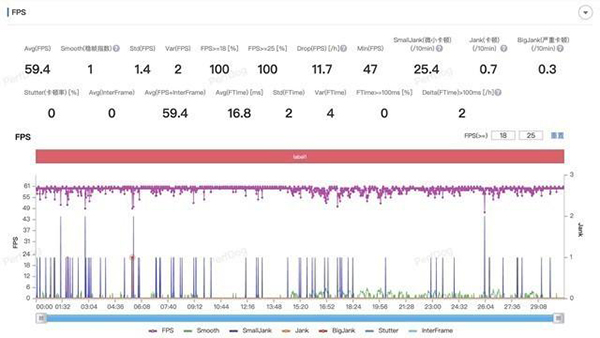 接下來便是大家熟悉的《原神》重負載測試,在性能模式下將《原神》畫質(zhì)選項設(shè)置為極高畫質(zhì)+60幀,測試場景為跑圖的測試中:小米13 Ultra的實測平均幀率為59.4幀,幀率曲線有一定波動,沒有出現(xiàn)大幅度降幀現(xiàn)象。