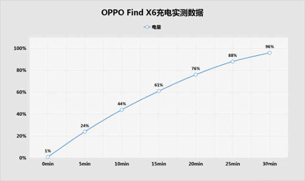 而在低電量情況下的極短時(shí)間充電場(chǎng)景中,OPPO Find X6這個(gè)80W超級(jí)閃充還是表現(xiàn)的不錯(cuò)的。同樣是從電量1%開始,1分鐘可充至5%,2分鐘可充至10%,僅需5分鐘,OPPO Find X6就可以充至遠(yuǎn)離紅區(qū)的24%,這對(duì)于低電量時(shí)的快速回血十分重要。