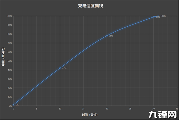 經(jīng)過(guò)測(cè)試,從1%開始充電,10分鐘充電至42%,20分鐘充電至78%,半小時(shí)充電99%,完全充滿用時(shí)31分鐘。