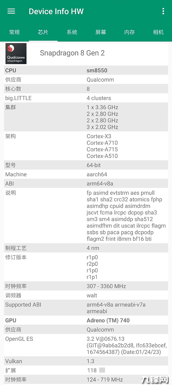 這個驍龍8Gen2領(lǐng)先版采用了臺積電的4納米制程工藝,并不是三星工藝,架構(gòu)方面依然是1+2+2+3設(shè)計,包括1顆超大核+2顆大核+2個中核+3顆小核,其中超大核的主頻為3.36GHz,大核和中核的主頻為2.8GHz,小核的主頻為2.0GHz,GPU頻率為719MHz。