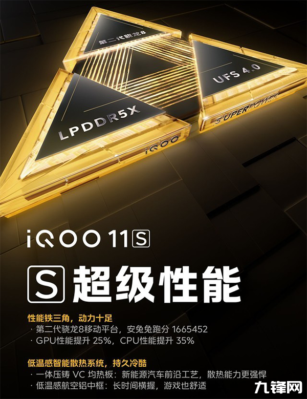 作為一款未來電競旗艦,iQOO 11S的性能是其主要賣點,該機搭載了“性能鐵三角”,包含第二代驍龍8移動平臺(也就是驍龍8Gen2)+全新一代LPDDR5X+UFS 4.0,全方面保證流暢體驗,這次的iQOO 11S在精心調(diào)校下安兔兔跑分可達1665452,GPU性能提升25%,CPU性能提升35%。