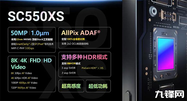 SC550XS是思特威去年3月發(fā)布的新品,采用22nm HKMG Stack工藝制程,搭載思特威SmartClarity-2成像技術(shù),以及SFCPixel與PixGain HDR專利技術(shù),擁有出色的成像性能,通過AllPix ADAF技術(shù)加持可實現(xiàn)100%全像素對焦,并配備了MIPI C-PHY 3.0Gsps高速數(shù)據(jù)傳輸接口,而且,22nm HKMG Stack工藝制程相對于業(yè)內(nèi)上一代主攝CIS所采用的40nm制程,器件速度更快、工作電壓更低,從而讓圖像傳感器能以更高的幀率及更低的功耗進行工作。