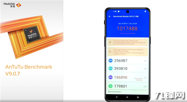 根據(jù)安兔兔v9.0.7測試總分1017488分,CPU得分256987,GPU得分393810,MEM得分186890,UX得分179801。