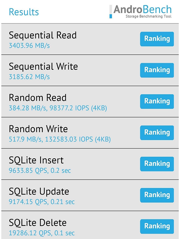 在Androbench測試中,順序讀取速度達到3403.96MB/s,順序寫入速度達到3185.62MB/s,在隨機讀寫方面,分別達到了384.28MB/s,517.9MB/s,在閃存方面與前代的iQOO 11沒有特別大的差異。