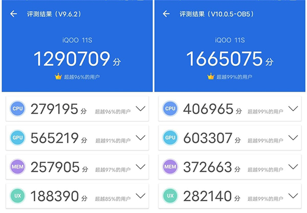 我們?cè)谶@個(gè)搭載驍龍8Gen2處理器的iQOO 11S手機(jī)上進(jìn)行了跑分測(cè)試,在配置規(guī)格上,iQOO 11S搭載驍龍8Gen2處理器,標(biāo)配4×16bit LPDDR5X 4200MHz內(nèi)存和UFS4.0閃存,在安兔兔V10中測(cè)試跑分為1665075分,在安兔兔V9中測(cè)試跑分為1290709分,不管哪個(gè)版本的跑分,在眾多處理器依然是旗艦級(jí)別的水平了。