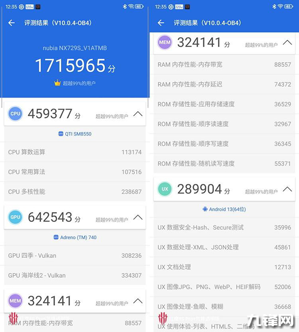 我們手頭這臺(tái)16GB+512GB的“次低配”紅魔8S Pro+,在最新的安兔兔評(píng)測V10 OB4版本中,獲得了超過171萬分的綜合成績,并且各子項(xiàng)成績也都達(dá)到了目前智能手機(jī)中的頂級(jí)水準(zhǔn)。