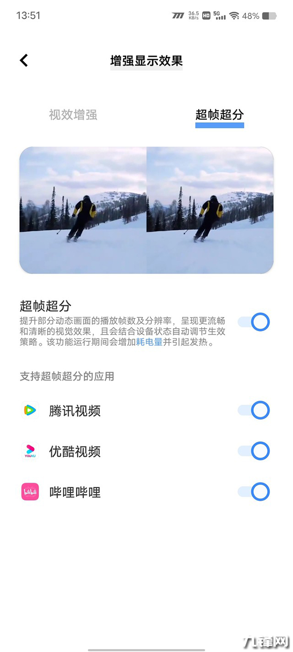 值得注意的是,基于這顆iQOO超算獨(dú)顯芯片,iQOO 11S還帶來(lái)了視頻超分超幀技術(shù),為主流的30幀普清視頻內(nèi)容源帶來(lái)清晰流暢的視覺(jué)體驗(yàn),目前已覆蓋了嗶哩嗶哩、優(yōu)酷、騰訊視頻等主流平臺(tái)的絕大多數(shù)視頻內(nèi)容。