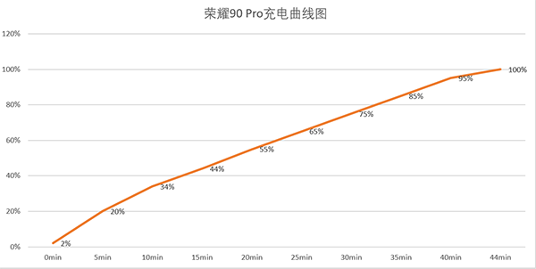 5分鐘充電20%,接下來差不多每隔5分鐘充電10%,30分鐘充至75%,44分鐘充滿,值得注意的是榮耀90 Pro塞下了一塊5000mAh容量的電池。