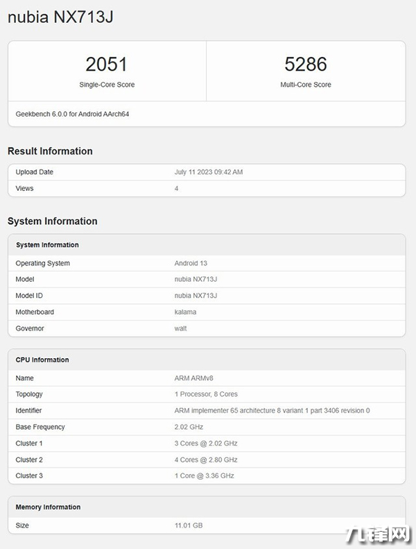 該手機(jī)已在Geekbench跑分?jǐn)?shù)據(jù)庫(kù)中出現(xiàn),型號(hào)為NX713J,采用代號(hào)為Kalama的主板。它由三個(gè)主頻為2.02GHz的核心、四個(gè)主頻為2.80GHz的核心和一個(gè)主頻為3.36GHz的核心組成,搭配Adreno 740 GPU,對(duì)應(yīng)驍龍8 Gen 2芯片。