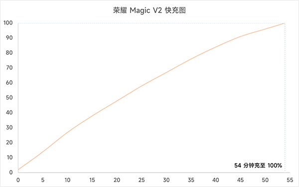 在這個快充方面,榮耀Magic V2是向上一代看齊,用的是66W的有線快充,并不支持無線充電。它能在54分鐘內(nèi)從2%充至100%,也還算是比較不錯的成績,算是向自家的直板旗艦看齊了,如果有無線充電,我想它的評價還會更高一些。