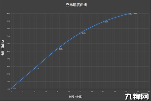 經(jīng)過實際測試,在手機(jī)電量為1%時開始充電,10分鐘充電至27%,20分鐘充電至53%,半小時充電74%,40分鐘充電89%,50分鐘充電至99%,完全充滿需要52分鐘。
