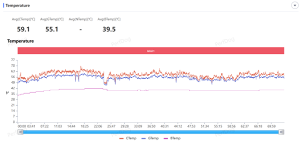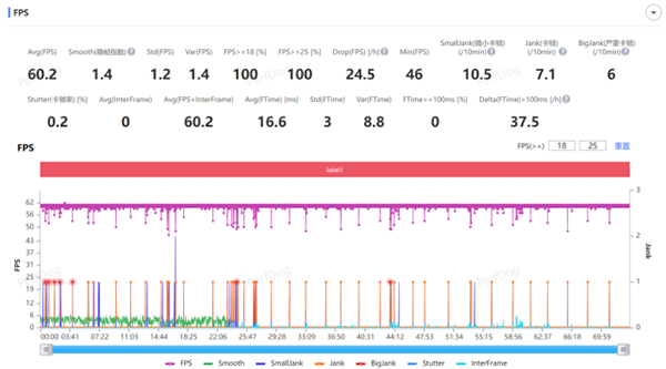 剔除UI切換的部分,全程平均幀為60.2,考慮到戰(zhàn)斗場景較多以及角色互動較多,這樣的表現(xiàn)也十分優(yōu)秀。盡管幀率曲線看起來波動較大,但大部分low幀都還有50幀左右,多是切換場景造成的波動,實際上察覺不到。而且在后30分鐘,也沒有出現(xiàn)過熱降頻的情況,整體表現(xiàn)很穩(wěn)定。