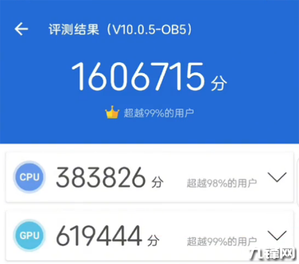 答案:1606715分,在安兔兔V10中跑出了160萬分的成績,性能提升在5%左右。