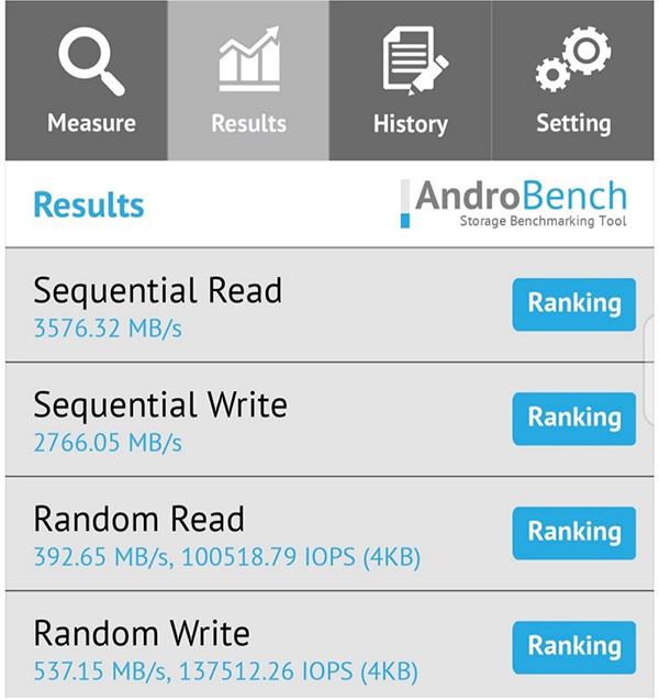 內(nèi)存測試中,努比亞Z50S Pro復(fù)制速度達(dá)到19GB/s,寫入速度達(dá)到54.5GB/s。
