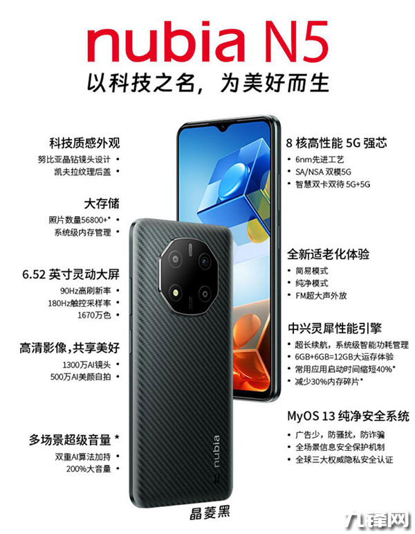 其他:厚8.5mm,重196.5g,晶菱黑配色,側(cè)邊指紋識別,保留3.5mm耳機(jī)孔,搭載MyOS13系統(tǒng)。