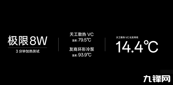 根據(jù)一加官方的測(cè)試,天工散熱VC在6.5w(原神重載場(chǎng)景的整機(jī)功耗)1分鐘和3分鐘的測(cè)試中,分別領(lǐng)先友商8.5°C和12.8°C,在8w(多重載后臺(tái)同時(shí)運(yùn)行的極限場(chǎng)景整機(jī)功耗)1分鐘和3分鐘的測(cè)試中,一加分別領(lǐng)先友商8.7°C和14.4°C。