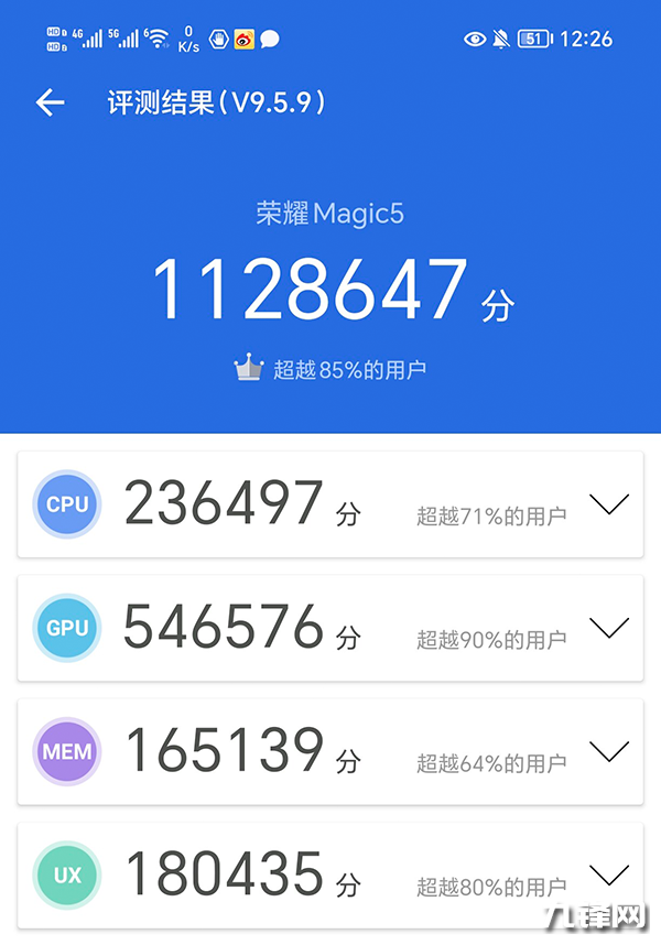 用Magic5在安兔兔V9中進(jìn)行了一下跑分測(cè)試,跑分是112萬分,Pro我查了一下跑分大概接近120萬分,少的這六萬多分應(yīng)該是UFS3.1比UFS4.0所缺失的性能分,因?yàn)椤?