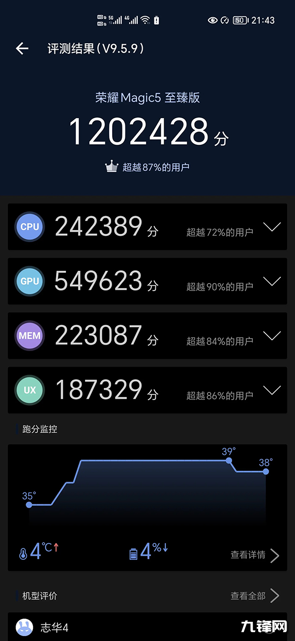 在這個(gè)性能配置上,榮耀Magic5至臻版搭載驍龍8Gen2芯片,Adreno 740 GPU,性能相比驍龍8Gen1提升25%,能效提升45%,搭配的是LPDDR5X內(nèi)存和UFS 4.0閃存,安兔兔V9跑分是120分,跑分雖然不是特別的高,不過性能目前還是屬于旗艦級(jí)別的,