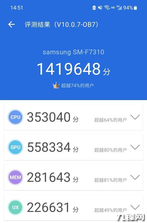 實(shí)測安兔兔跑分將近142萬分,CPU得分353040分,GPU得分558337分,內(nèi)存得分281643分,UX人機(jī)得分226631分。
