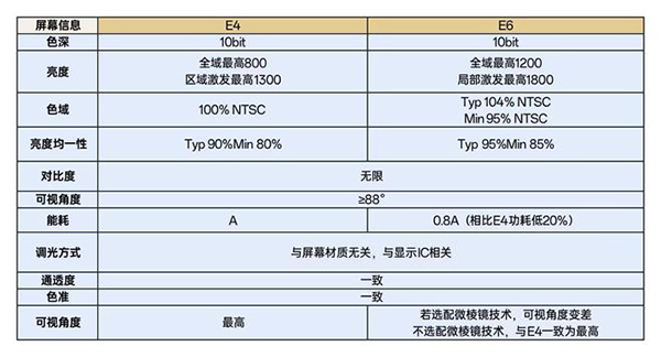 從主要的參數(shù)情況來看,E6材質(zhì)相較于E4材質(zhì)而言,主要的提升是集中于亮度以及功耗方面的表現(xiàn)。譬如E6在亮度上可全域最高1200nit,局部最高1800nit的效果,而E4對應的則是800nit、1300nit的水平,確實要落后一些。
