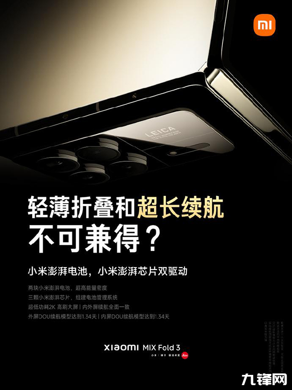 這次的小米MIX Fold3折疊屏,可以放心隨便用,無論是內(nèi)屏還是外屏,這款手機的DOU續(xù)航模型均高達1.34天。在小米MIX Fold3的內(nèi)部,小米準備了兩塊小米澎湃電池和三顆小米澎湃芯片,它們是小米MIX Fold3續(xù)航持久的原因之一。