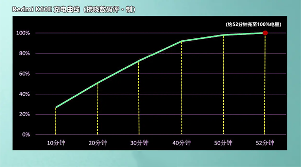 在實(shí)際測(cè)試過程中,Redmi K60E這塊5500mAh的大電池明顯對(duì)67W快充施加了不小壓力,但仍然可以在52分鐘將手機(jī)從0%空電充至100%滿電。