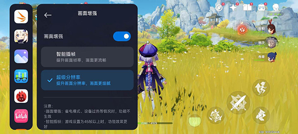 在游戲中,屏幕左上角內(nèi)劃,呼出「游戲工具箱」,「畫面增強」中包括「智能插幀」與「超級分辨率」選項,選擇即可開啟。