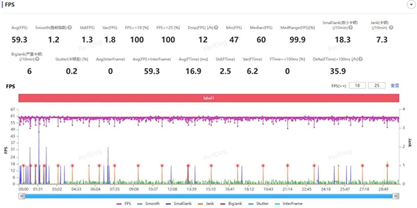 雖然這次的平均幀率還是59.3,但從數(shù)據(jù)上可以看出,平均10分鐘微小卡頓次數(shù)從18.3降低到了12.6,卡頓次數(shù)則從7.3降到了5.3。