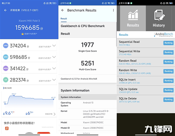 小米MIX Fold 3搭載第二代驍龍8領(lǐng)先版,CPU超大核的頻率從3.19GHz提升到了3.36GHz,GPU頻率從680MHz提升到了719MHz,應(yīng)該說是目前公認最頂級的平臺了。在此基礎(chǔ)上,手機還提供了LPDDR5X 8533Mbps+UFS 4.0的內(nèi)存組合。
