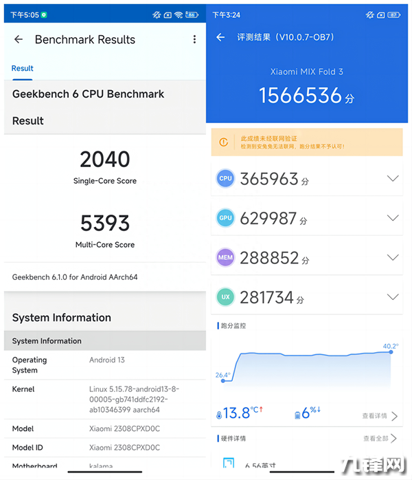 通過GeekBench測試,小米MIX Fold3的單核成績?yōu)?040,多核成績?yōu)?393。