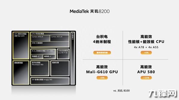 在這個配置規(guī)格上,vivo S16 Pro采用了天璣8200+LPDDR5+UFS 3.1的性能鐵三角,主要的升級點其實是在處理器方面。天璣8200處理器可不是個簡單的升級版,它采用更先進的4nm工藝技術(shù),光是這一點就比天璣8100領(lǐng)先很多了。