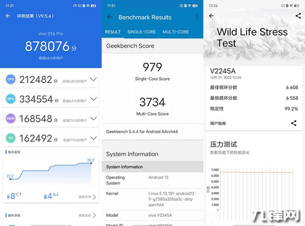 安兔兔跑分是在87W,相比前代小幅度提升;GeekBench5跑分測試,單核得分979,多核得分3734,單核提升7.8%,多核提升11.4%;3DMark 20次循環(huán)測試場景,穩(wěn)定性高達99.2%。