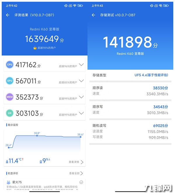 此次測試的Redmi K60至尊版為24GB內(nèi)存+1TB硬盤的頂配版本,配合天璣9200+旗艦級(jí)移動(dòng)平臺(tái),在安兔兔V10中的跑分達(dá)到了1639649分,存儲(chǔ)的得分為141898分,性能表現(xiàn)優(yōu)秀,位居行業(yè)領(lǐng)先水平。