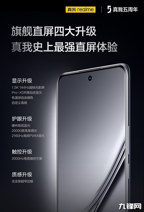 官方稱真我GT5是「真我史上最強(qiáng)直屏體驗(yàn)」,并且采用1.5K分辨率144Hz刷新率的居中單挖孔直屏,2000Hz電競(jìng)操控引擎,2160Hz PWM高頻調(diào)光,硬件級(jí)低藍(lán)光,屏幕沒(méi)有塑料支架,邊框窄至1.46mm(*小米13邊框?yàn)?.61mm)。?