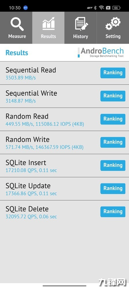 在AndroBench存儲(chǔ)測試中,真我GT5的順序讀取速度為3503.89MB/s,順序?qū)懭胨俣葹?148.87MB/s,隨機(jī)讀取速度為449.55MB/s,隨機(jī)寫入速度為571.74MB/s。