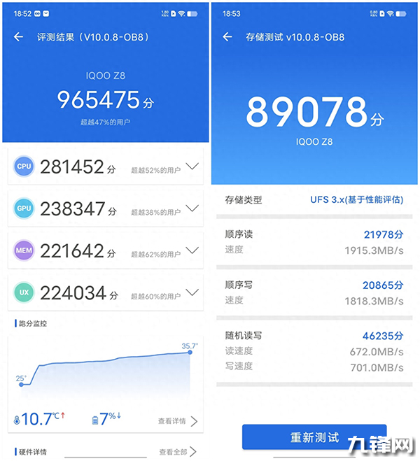 我們手上這臺iQOO Z8的跑分成績?yōu)?65475,CPU成績?yōu)?81452,GPU成績?yōu)?38347;存儲測試中,順序讀取速度為1915.3MB/s,順序?qū)懭胨俣葹?818.3MB/s,總成績?yōu)?9078分。