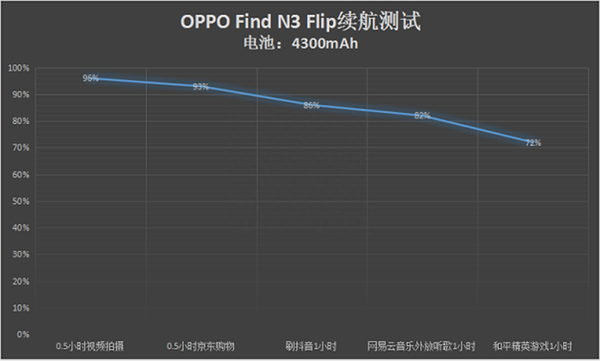 通過運行了4小時的續(xù)航測試,其中包括0.5小時視頻拍攝(使用后置攝像頭)、0.5小時京東購物、刷抖音1小時、網(wǎng)易云音樂外放聽歌1小時(音量50%/手機折疊)、和平精英游戲1小時。最終,在4小時的續(xù)航測試后,OPPO Find N3 Flip的剩余電量還剩下72%??梢哉f,在豎屏折疊手機領域,OPPO Find N3 Flip的續(xù)航實力堪稱佼佼者。