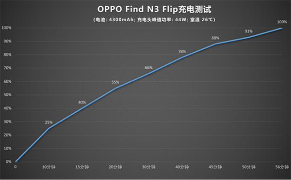 經(jīng)過實測,F(xiàn)ind N3 Flip在10分鐘時間可以將電量充至25%,最終56分鐘可將手機電池充至滿電。一般利用午休時間,這款折疊屏手機基本上就能“滿血復活”。