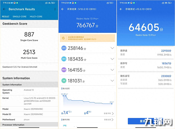 安兔兔V10版本跑分中Redmi Note13 Pro+的綜合得分為766767分,內(nèi)存測試中,測得順序讀取速度為1998.3MB/s,順序?qū)懭胨俣葹?600.7MB/s,隨機(jī)讀取365.0MB/s,隨機(jī)寫入為328.0MB/s。而GeekBench5跑分中,Redmi Note13 Pro+單核887分,多核2513分。