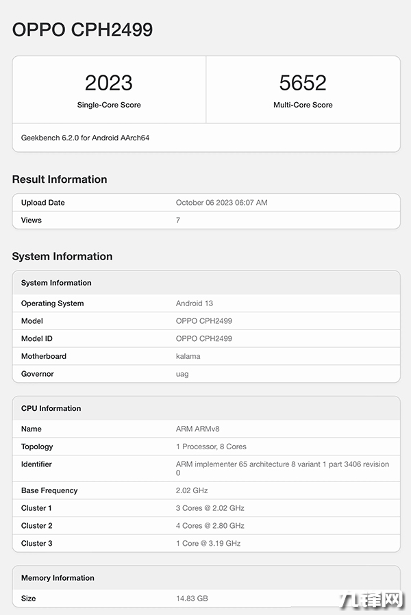 OPPO Find N3的Geekbench6跑分出爐,搭載驍龍8Gen2芯片處理器,16GB RAM,單核2023分,多核5652分。