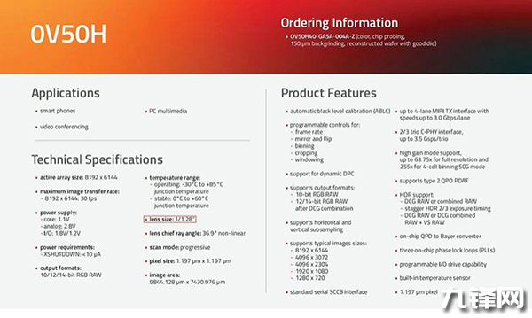 豪威OV50H影像傳感器發(fā)布于今年1月,四合一像素合并可實現(xiàn)1250萬像素視頻和預(yù)覽,具有2.4微米等效靈敏度,可實現(xiàn)出色的弱光性能;支持高達(dá)120幀/秒的幀率,具有4x弱光靈敏度;8K視頻,采用片上像素還原算法;4K視頻+電子圖像穩(wěn)定功能,包括120幀/秒(線性)和60幀/秒(HDR)。